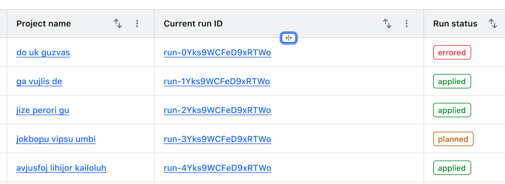 When resizable columns are enabled, actions related to each function are rendered in a context menu in the table header. These functions are not customizable.